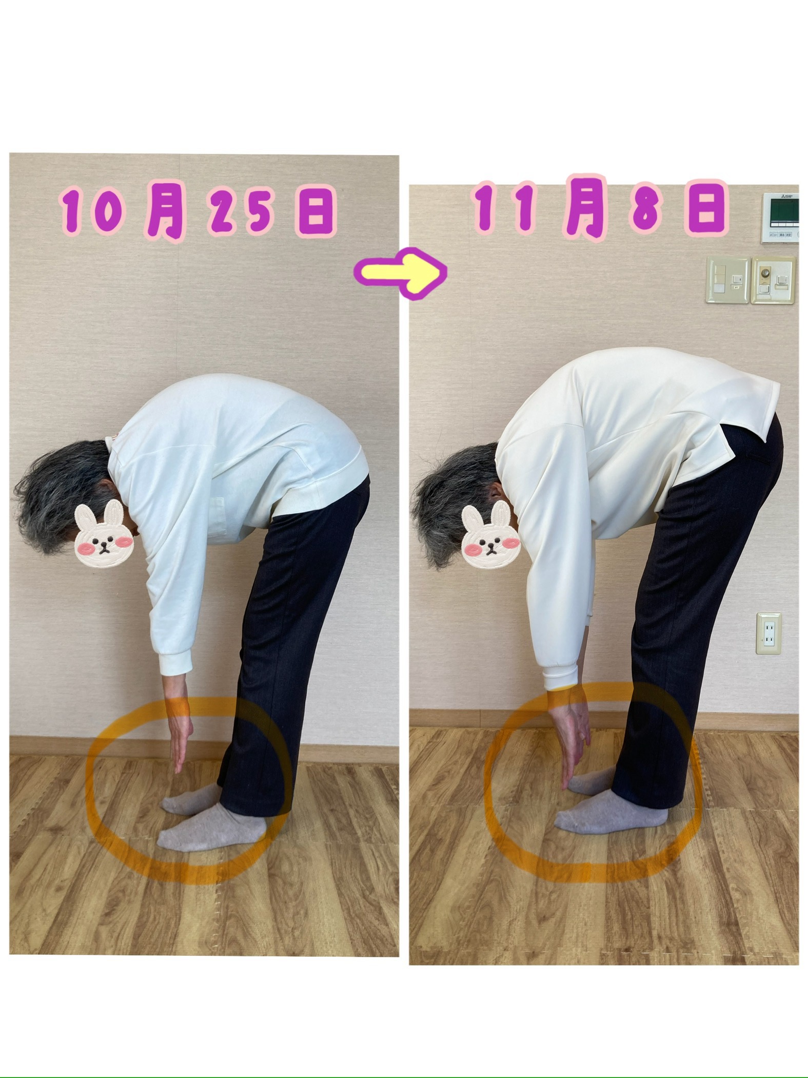 トレーニング開始2週間で早速良い変化がありました! 腰が柔軟になり、前屈が深く曲がるようになりました👏✨! (写真で見ると以前は背中から曲がっていたのが2週間後は腰から曲がるようになりました)