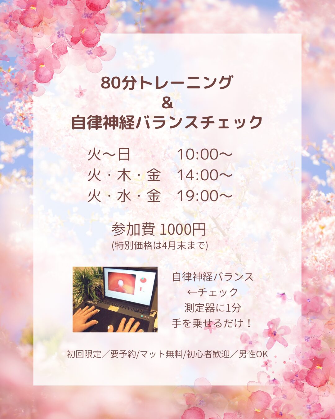 特別キャンペーン 春の不調リセット!80分トレーニング&自律神経バランスチェック 寝ても疲れがとれない。春の不調、睡眠、ストレス対策に! ◆スケジュール 火~日 10:00~ 火・木・金 14:00~ 火・水・金 […]